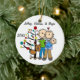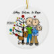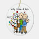 A pretty round ceramic keepsake Christmas holiday ornament features a stick figure couple with a baby boy in a blue blanket and a dog standing in front of the decorated Christmas tree with areas you can easily customize with names and date to the current year! This beautiful holiday keepsake ornament makes a great gift for anyone who had a new baby boy in the current year!