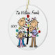 A pretty round ceramic keepsake Christmas holiday ornament features a stick figure family including a dad, mom, toddler girl, and and baby boy in front of a decorated Christmas tree with areas you can customize with your family name and the current year! This cute holiday keepsake ornament makes a great gift for the young family to commemorate a special year!