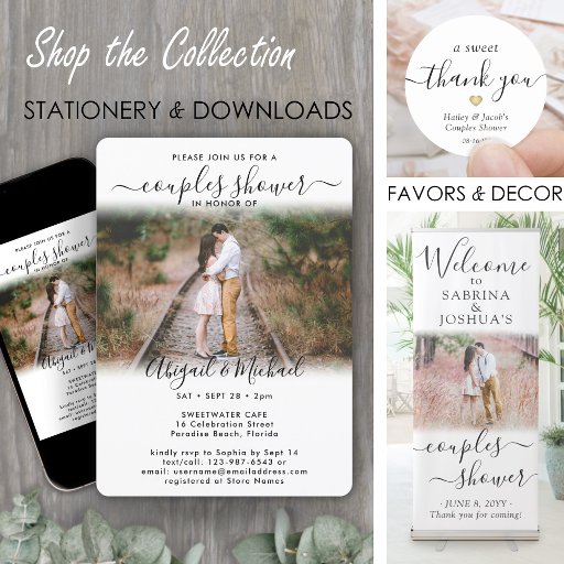 Welcome guests to a stylish couples wedding shower with an elegant custom 3 photo collage 18"x24" poster. Pictures and all text are simple to personalize. (IMAGE PLACEMENT TIP: An easy way to centre a photo exactly how you want is to crop it before uploading to the Zazzle website.) The modern minimalist black and white design features three images of your choice, chic handwritten style script calligraphy, and elegant vintage typography. This couples bridal shower welcome sign is a stylish way to share engagement pictures as a part of your special day celebration decorations. Congratulations to the bride and groom!