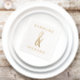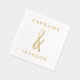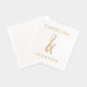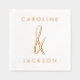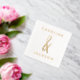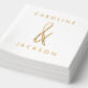 Serviettes de mariage élégantes en or dévoilées, avec une esperluette dessinée à la main entre les noms du couple dans une police moderne.