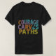 The t-shirt design features the phrase "Courage Carves Paths" in bold, multi-coloured lettering. The vibrant colours and dynamic font create a visually striking and inspiring statement. The design conveys a message of perseverance, determination, and the power of courage to overcome challenges and create new opportunities.
