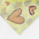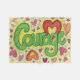 The inspirational word "Courage" is a bright green against a pale yellow. The word is surrounded by floating peach, pink, and red hearts. The "Courage" artwork was rendered in multimedia of pastel and watercolor on paper. Inspirational artwork by Laurel Latto for DonnaBellas Angels.