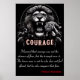 Unleashed Courage is depicted in this high-contrast black and white image. A fierce lion roars, a display of raw power, while a small tiger cub playfully climbs on its back. The dark background emphasizes the subjects. "Courage" is written in bold, elegant red font in a stylized text box below. Nelson Mandela's quote reinforces the theme: "I learned that courage was not the absence of fear, but the triumph over it. The brave man is not he who does not feel afraid, but he who conquers that fear."