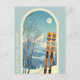 Postcard from a wonderful skiing holiday in the beautiful French mountains of Courchevel, France! This postcard features an arch with a stunning blue-grey mountain landscape and retro ski boards in an orange tribal pattern in the foreground. The rest of the card is in a lovely light blue tone with the location lettering in a modern font. The card is a lovely combination of retro and modern, and I hope you enjoy it!