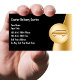 Courier delivery service business cards with modern design and gold coloured delivery van on the front of the card, with metallic looking emblem and text layout you can easily customize the way you want. Designed for a package delivery or courier service, transportation or transport vehicle.
