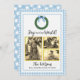 Cette carte de Noël classique comporte une bordure en plaid bleu aquarelle avec une couronne d'aquarelle avec arc bleu. Personnalisez avec vos propres noms et photos de famille. Lit "Joy to the World !"