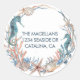 Les autocollants d'adresse de retour sur le thème "Sous l'océan" présentent une couronne aquarelle avec du corail, un hippocampe, une étoile de mer, des coquilles et des algues dans des tons bleus et beige côtier.