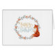 Aquarelle design avec renard rouge et couronne fleurie avec "Joyeux anniversaire" en écriture moderne