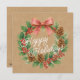 Cette carte de vacances magnifiquement conçue présente d'élégantes aquarelles d'une couronne ornée d'un arc rose, de pinecones, de feuilles saints, de baies rouges et d'aiguilles de pin. Son design élégant mais rustique saisit l'essence de la période des fêtes de décembre et séduit ceux qui apprécient les illustrations artistiques. La carte offre des options de personnalisation, vous permettant de la personnaliser avec votre nom de société, nom de famille ou nom individuel. En outre, vous pouvez inclure un poème de salutation saisonnier sur le front, ce qui en fait un choix réfléchi pour diffuser la joie des vacances.