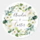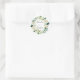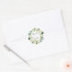 Autocollant rond classique de mariage avec une couronne de fleurs blanches aquarelles avec feuillage vert. Pour une personnalisation avancée de ce design, veuillez cliquer sur le bouton "Personnaliser". Des articles assortis sont également disponibles.