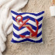 Ce design nautique dynamique présente une ancre rouge sur un motif rayé bleu marine et blanc chevron. L'envers affiche uniquement le motif de bandes de chevrons pour la polyvalence de l'affichage du coussin.