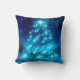 Un coussin avec un arbre de Noël bleu électrique moderne. Décoré de lumières tout autour. L'arrière - plan a perdu ses lumières floues.