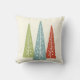 Cet oreiller à thème de Noël illustre un trio d'arbres à feuillage persistant dans un style simple et moderne, vert clair, bleu clair et rouge contre un arrière - plan crème. L'envers a une coordination sur tout le motif des arbres.