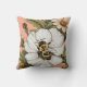 A throw pillow that has a cute bee gathering pollen on some flowers with an peach pink back round.