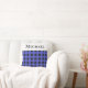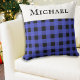 Coussin design pour un lit, une chaise ou un canapé, à motif de buffle en bleu et noir. En haut se trouve un groupe blanc, avec le nom que vous avez choisi en lettres majuscules noires. Le coussin à baldaquin fait un cadeau sur mesure élégant pour les amis, la famille et les collègues, à Noël et toute l'année.