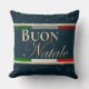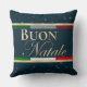Cet élégant oreiller de bienvenue présente un thème de Noël italien sur un arrière - plan bleu foncé. Le salut Buon Natale, qui est Joyeux Noël en Italie, est imprimé dans le centre dans une police en feuille d'or. Une image estampillée du drapeau italien est imprimée derrière le salut natale du bouillon. De petits flocons d'or sont parsemés sur l'arrière - plan.