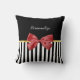 Un élégant oreiller carré à rayures verticales en noir et blanc, agrémenté d'une bande élégante couleur or FAUX et d'une image d'un arc de style ruban rouge. Personnalisez-le en ajoutant le nom de cette fille spéciale dans votre vie. Image imprimée plate, NON métallique ou arc réel.