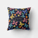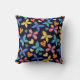 Sur ce mignon oreiller de lancer personnalisé, des images colorées de papillon et de coeur de style boho font un motif brillant sur un arrière - plan bleu marine. Les couleurs de l'image sont rose, bleu clair, orange et jaune. Le front a également un ovale bleu marine assorti avec votre nom en jaune. Le dos a le même motif de coeur papillon, mais sans la bannière du nom.