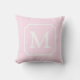 Ce design coussin a un arrière - plan rose pâle partout. Au centre se trouve un cadre carré entaillé blanc avec une initiale en monogramme blanc.