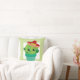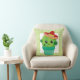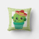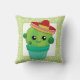 Un coussin avec une jolie illustration d'un cactus vert assis dans un pot de fleurs. Gros yeux kawaii et portant un sombrero rouge. L'arrière - plan est un motif avec des tourbillons vert citron.