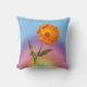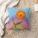 La fleur de Calendula orange sur une tige est présentée devant un arrière - plan à motif arc-en-ciel. Dew ou gouttes de pluie ornent les pétales de la fleur. Reverse du coussin montre arc-en-ciel seulement.
