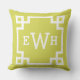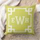 Le design élégant et moderne du coussin carré accent dispose d'un cadre géométrique clé grecque et monogramme qui peut être personnalisé. Chartreuse jaune / vert et blanc couleurs. La couleur Arrière - plan peut être modifiée.