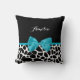 Un chic carré à tirage de girafe noir et blanc lance l'oreiller avec un ruban bleu aqua branché dans un arc de poule. Personnalisez ce joli dessin animal en ajoutant votre nom. Le côté inverse a un motif de girafe noir et blanc. Impression plane, pas arc réel.