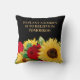 Jetez un oreiller décoré de belles roses rouges élégantes et de tournesols jaunes sur un arrière - plan noir. Un texte inspirant dit : "plante un jardin, c'est croire en demain."