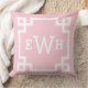 Le design élégant et moderne du coussin carré accent dispose d'un cadre géométrique clé grecque et monogramme qui peut être personnalisé. Couleurs claires rose et blanc. La couleur Arrière - plan peut être modifiée.