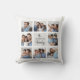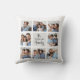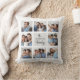Ce coussin simple et élégant présente votre nom de famille dans un script noir moderne écrit à la main sur un carré gris chic au centre. Il est entouré d'une grille de collage de photos avec une salle pour montrer huit de vos photos personnelles préférées pour un cadeau unique que votre famille aimera.