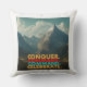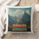 Le texte "Conquer, Commander, Célébrer." est imprimé dans une police manuscrite et ludique au centre du coussin. L'arrière - plan est une illustration colorée d'un paysage urbain dans les tons bleu, vert et jaune.