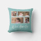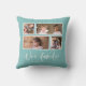 Oreiller présentant les mots "Notre famille" dans un script élégant blanc avec 4 photos avec une bordure blanche autour d'elles disposées côte à côte sur les côtés avant et arrière, ce qui fait 8 photos au total que vous pouvez remplacer par vos propres photos sur un fond de couleur modifiable (cliquez sur "personnaliser" pour changer la couleur de fond). Vous pouvez également ajouter le nom de votre famille et l'année de création. Parfait pour la décoration intérieure, les jeunes mariés, les souvenirs de famille, etc.