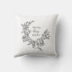 Cet oreiller de mariage romantique présente une jolie couronne botanique illustrée avec des noms personnalisés et des lettrages de script d'amour tendance. Ce beau design noir et blanc est un cadeau parfait pour une mariée ou une petite amie. Visitez cette boutique pour des cadeaux et une décoration intérieure élégante coordonnés.
