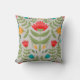Un oreiller à motifs floraux stylisés, orné de fleurs vert orange rouge sur un arrière - plan gris clair, est posé. Style artistique. Pour n'importe quelle chambre.