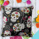 Un modèle d'oreiller à jetons coloré pour les festivités du Jour des Morts ou pour convenir à votre humour amusant et quotidien, avec une variété de crânes à sucre décoratifs avec des accents de fleur et tourbillonnants sur un arrière - plan noir en option. Cherchez ID725 pour voir d'autres choix de couleurs et produits avec ce motif amusant.