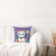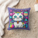Adorable coussin avec un mignon chat kitty caricaturé blanc, fantaisiste, avec de grands yeux bleus, des oreilles roses et portant un collier brillant et coloré. Elle a une jolie queue rayée bleue, rose et blanche et une bande bleue sur la tête. L'arrière - plan est principalement violet avec des planètes, des nuages, des étoiles et des fleurs dans un mélange de couleurs audacieuses, vives et vives. Idéal pour tous ceux qui aiment les chats et l'espace.