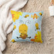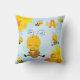 Add a cute touch to your little's menacom or nursery with this adorable bumble bee throw pillow. Pillow fesix happy bees, one with honey, and the others buzzing around. There are yellow and orange flowers and a soft blue background. Dans la corner there's a place for your young kid's first name and monogram initial. This pillow works well for boys and girls and is great for baby showers, birthdays, and holidays.