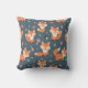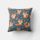 Un coussin avec un motif fait de renards orange mignons et heureux. Arrière - plan vert foncé. Petits champignons et feuilles parsemés.
