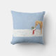 coussin de la série Horse of Course avec un cheval mangeant le nez de carotte d'un bonhomme de neige parmi les flocons de neige doux. Les couleurs dominantes sont le bleu, le blanc, le rouge et le bronzage.