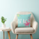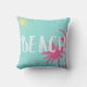 Lumineuse turquoise jetée oreiller avec palmier rose et "plage" écrit en blanc.