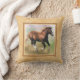 Un carreau ou un coussin carré avec un cadre de frontière aux nuances de bronzage beige et léger, avec une peinture numérique d'un poulain avançant à petit galop de cheval de trait d'oseille sur un pastel a coloré l'arrière - plan.
