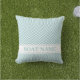 Coussin extérieur Aqua Herringbone motif. Décor extérieur côtier avec motif géométrique dans Aqua Blue et modèle de nom de bateau pour les coins salon extérieurs. Pour la maison de plage ou la décoration nautique de la maison sélectionnez le coton ou polyesthétique matériau. Ce coussin personnalisé est une belle idée cadeau pour elle et lui, plaisanciers et marins. La terrasse décorant des idées faites avec amour pour l'océan. © Design y.BEE SEA