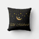 Caractéristiques des lumières de Ramadan Eid et une typographie Eid Mubarak dorée sur fond noir, de belles décorations modernes de Ramadan et d'Eid pour la maison ou la fête. Décoration de coussin Eid par Arabix.