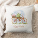 Coussin décoratif "Joyeux Pâques" avec l'image d'un lapin sur un vélo.