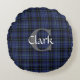 Ajoutez un contact classique à n'importe quelle pièce, avec ce coussin rond d'accent de tartan écossais traditionnel décoré d'un monogramme fait sur commande. Le motif bleu, gris, et noir classique de plaid de clan de Clark couvre les deux côtés de ce carreau élégant. L'avant du coussin, a un grand monogramme de lettre du gris un et le texte blanc, les deux préparent pour personnaliser. Grande idée de cadeau !
