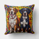 OEuvre colorée en vitrail représentant deux chiens assis contre un arrière - plan géométrique vibrant aux détails complexes et à l'éclairage radieux.