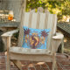 Ce coussin extérieur de fête comporte une silhouette d'une femme montant une planche de surf entourée par des palmiers et des fleurs tropicales"