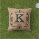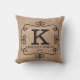 Coussin monogramme famille avec arrière - plan d'impression de burlap rustique. Le coussin de style champêtre peut être personnalisé avec votre lettre initiale monogramme, nom de famille et année établie. REMARQUE : Le burlap n'est imprimé qu'à effet et non réel.