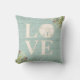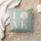 Un oreiller de Noël Jetant le mot LOVE. Décoré d'un dollar de sable, d'herbes de plage, de baies et d'un arrière - plan en bois patiné pour votre décor de Christmas Beach.