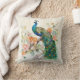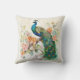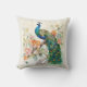 Le décorateur lance l'oreiller avec un tableau d'un élégant paon bleu et vert dans les branches d'un arbre plein de fleurs roses et de couleur pêche.